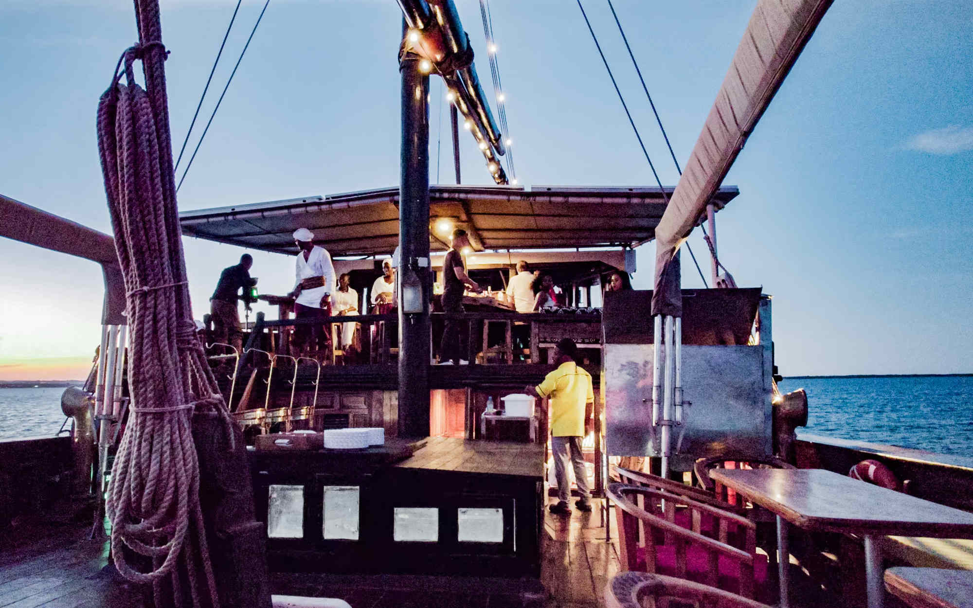 But why, with all that sail power, were engines necessary? "In the past," Bakewell explains, "dhows would go from point A to point B with the monsoon winds. But we cruise, we move outside the monsoon winds. If you are carrying a charter group or an expedition that wants to go to a particular place within a certain timescale, you cannot rely on the vagaries of the Indian Ocean's weather patterns."